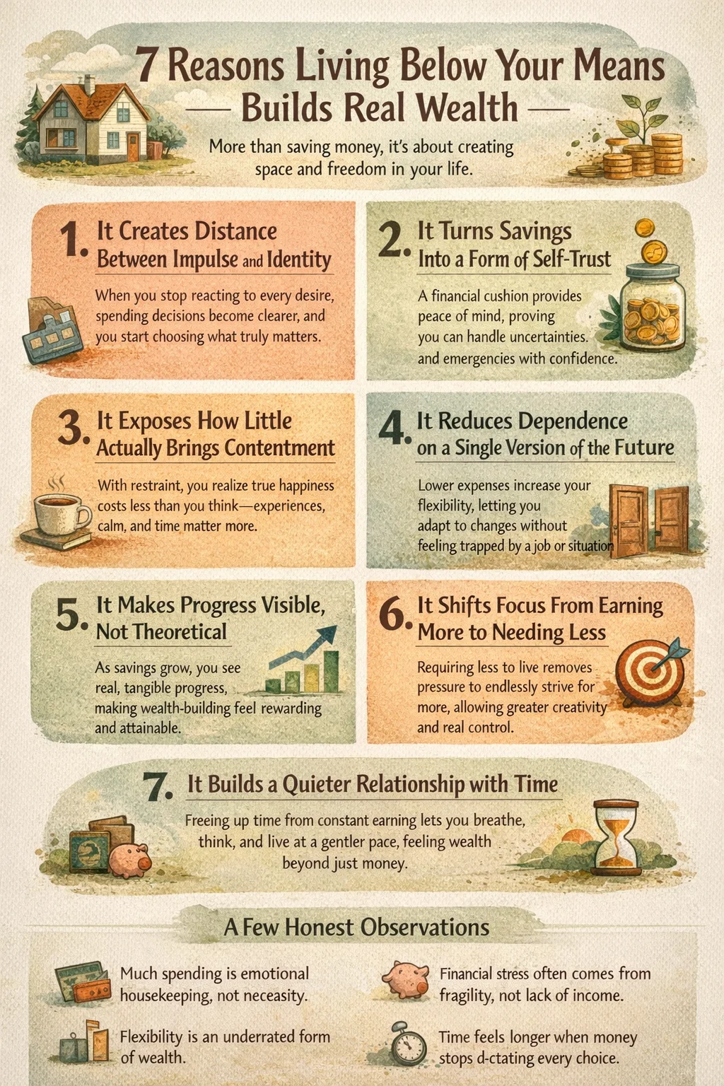 In the end, living below your means isn’t about restriction. It’s about space. Space to think, to choose, to adapt. Real wealth, I’ve come to believe, isn’t loud. It doesn’t announce itself through upgrades or milestones. It shows up quietly, in the form of fewer worries and more room to breathe.